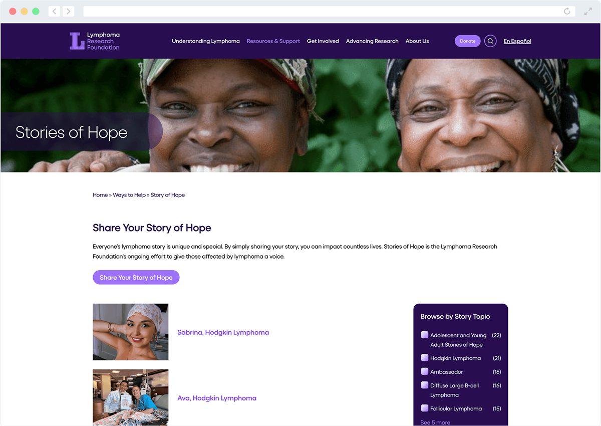 This page is titled “Stories of Hope” and features a variety of firsthand accounts of people affected by lymphoma. Users can click through to read stories from survivors, helping to understand the need for the nonprofit’s work.